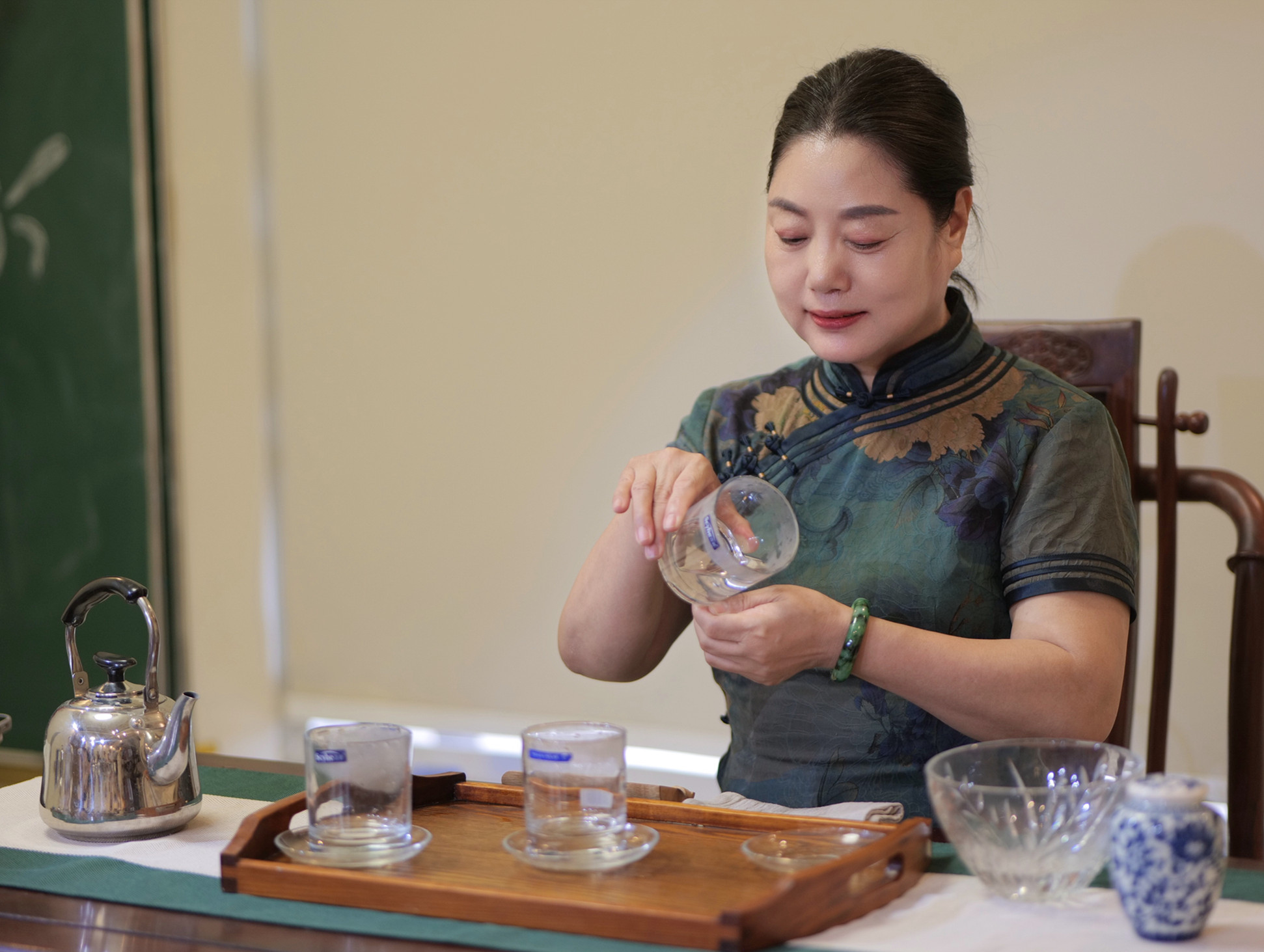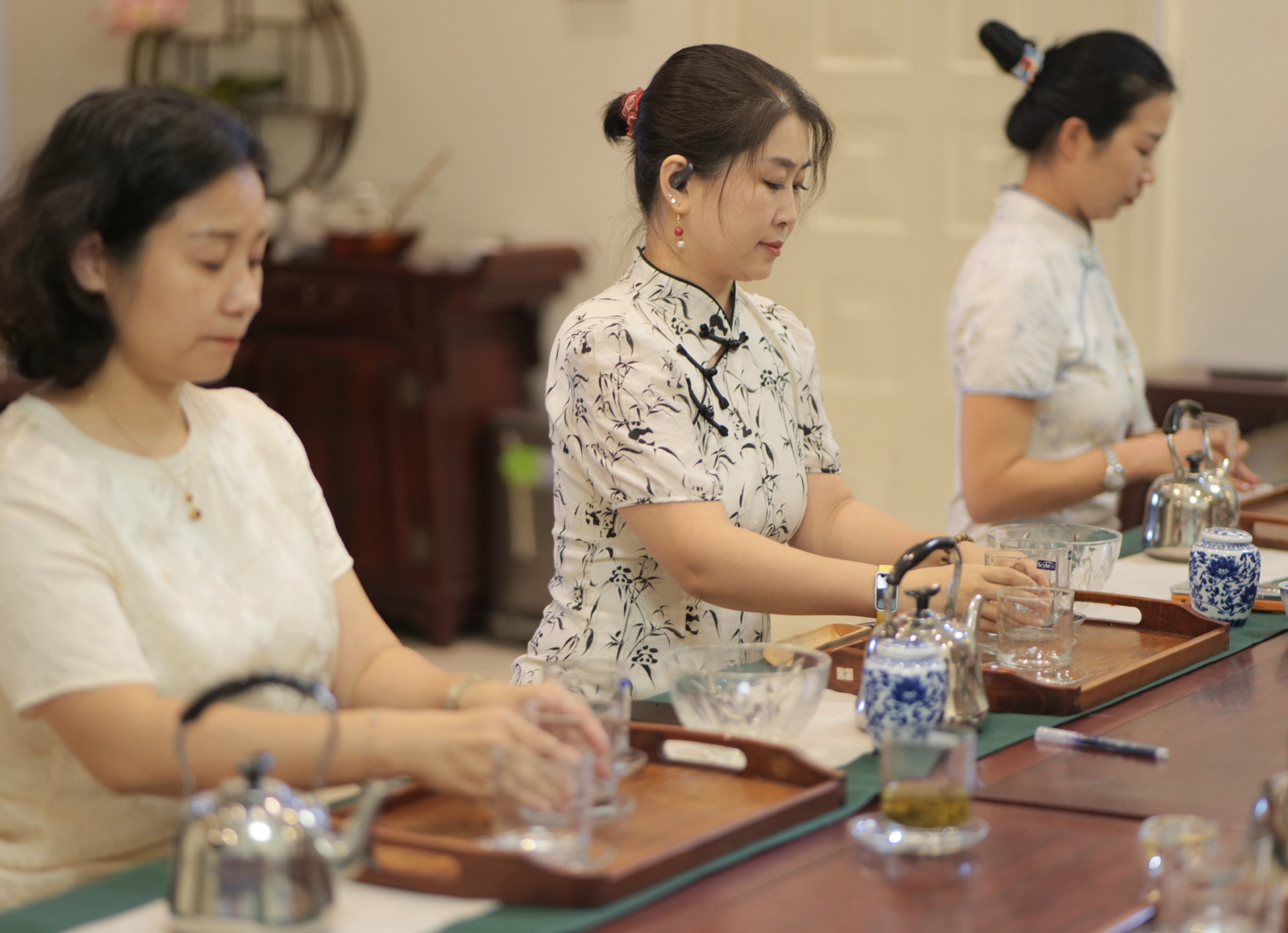 着妆要求:淡妆、盘发、茶服或旗袍