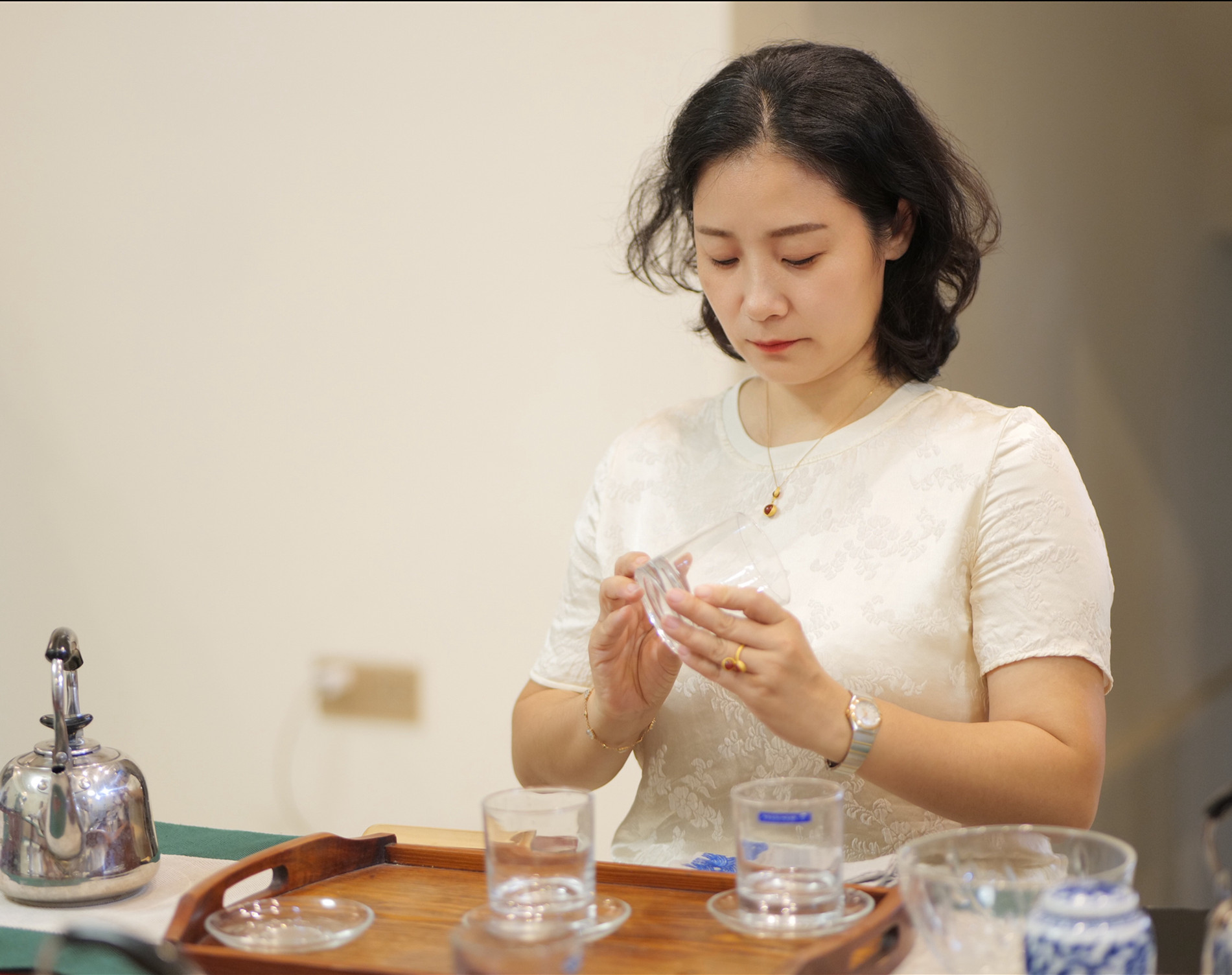 玻璃杯适用于冲泡名优绿茶,因为玻璃杯质地致密,孔隙度小,且其透明,不容易吸香,用其泡茶可使茶之清香、嫩香充分显露出来,也便于我们欣赏茶芽形态和茶汤的颜色。由于不同绿茶的条索形状和紧结度不同,使得茶芽在水中的沉降速度不一,可分别用上投、中投、下投法。本次课堂学习的正是绿茶下投法技能训练,下投法就是先放茶叶,再注少量水浸润泡,然后用凤凰三点头的方法注水到七分满。